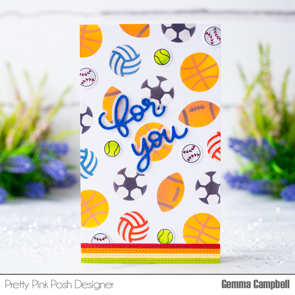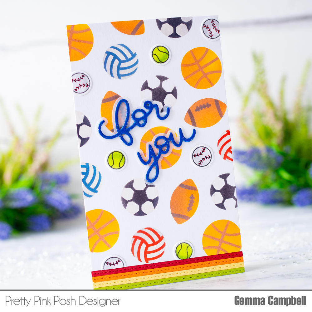 After mistakenly colouring all the smaller balls on the stencil as tennis balls, I realised they should’ve been a mix of tennis and baseballs. Rather than start again, I added the stamped and copic coloured images from the Sports stamp set as an easy fix. I like the combination of stencil and stamped images too.
