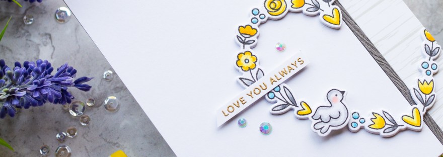Today I’m using the new Large Floral Hearts stamp set from Pretty Pink Posh. I’ve gone for a soft yellow, blue and grey colour scheme as a change from reds and pinks. I stamped the Large Floral Heart image with black ink, coloured it with copic markers, then die cut with the coordinating die. The two birds… Continue reading Floral Heart