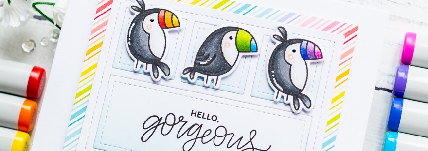 I love to incorporate rainbows on my cards and the Pretty Pink Posh Tropical Toucans are perfect for doing just that. I coloured three of the Tropical Toucans with copic markers, adding rainbow colours to their beaks. I used the coordinating dies to cut them out. Next, I die cut the Storybook 2 die from… Continue reading Rainbow Toucans