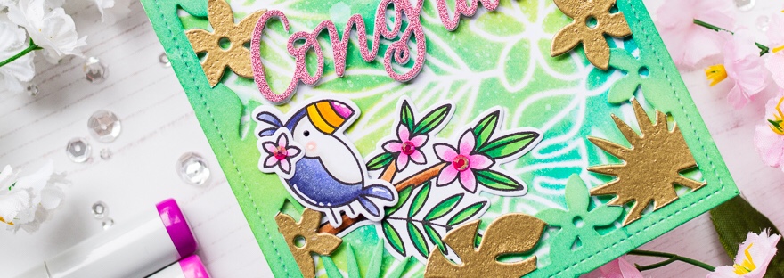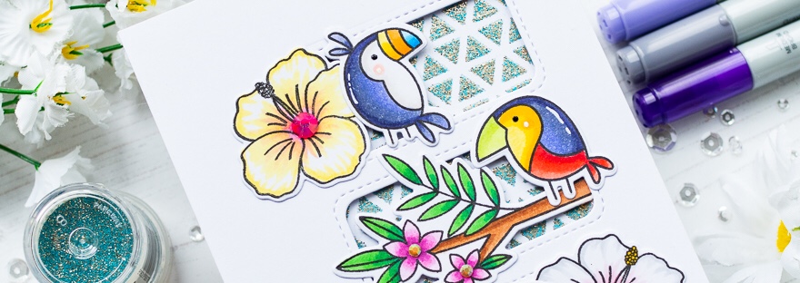 Today I have a card showcasing some of the fabulous new June release from Pretty Pink Posh. These cute birds and the branch are from the Tropical Toucans stamp set. I love the size as it means I can fit all three of them on my card together. I began with the background. I taped… Continue reading Pretty Pink Posh Tropical Toucans