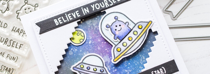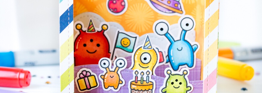Today I’m sharing a shadow box card featuring the cute aliens from Lawn Fawn Beam Me Up. I usually create a galaxy background when I make space related cards, but I thought it would be fun to use some bright colours this time, to create an alien landscape. I chose some patterned paper from my… Continue reading Alien Birthday Shadow Box Card