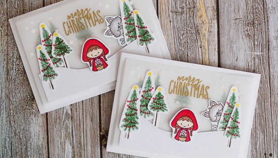 This year I'm making my own Christmas cards, so decided I also wanted to make special Christmas cards for my nieces and nephew. The Clearly Besotted Once Upon a Time stamp set has fun fairytale characters and sentiments. I thought the Red Riding Hood character would look great in a winter forest scene. For the… Continue reading Little Red Riding Hood at Christmas