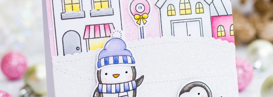 My card today features the new Village stamp set from the Pretty Pink Posh October release. I've teamed it with the previously released Penguin Pals stamp set, for a penguin skating Christmas party. The Village stamp set coordinating dies will cut the image of all three buildings as one piece. As I wanted to use… Continue reading Penguin Village
