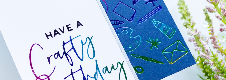 Today I’m sharing a card I made with the Spellbinders August 2020 Glimmer Hot Foil kit and the add-on set. This month, you get Have a Crafty Day - a set of 6 glimmer plates, along with a roll of Aura foil. In the kit, there is one large border of crafty images, then 5 accompanying… Continue reading Spellbinders August 2020 Glimmer Hot Foil Kit