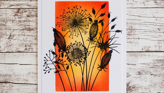 Sometimes it's nice to make a stamp the focus of a card. The Woodware Going to Seed stamp is a beautiful large intricate stamp, that really works as a focal point. I started by making my own rectangle stencil from white card, using a rectangle die. I taped the stencil over another piece of card,… Continue reading Sunset Distress Ink Background