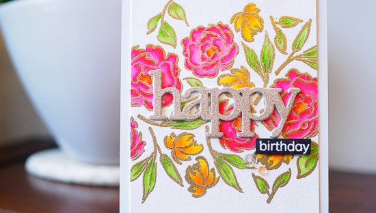 As part of the Daily Marker 30 day challenge, I've been stamping images and colouring them in using different techniques. I created this peony background on Day 4, and I wanted to turn it into a card. How I made this card: I stamped and heat embossed in gold some flowers and leaves from the… Continue reading Daily Marker Colouring Challenge: Peonies and Embossing